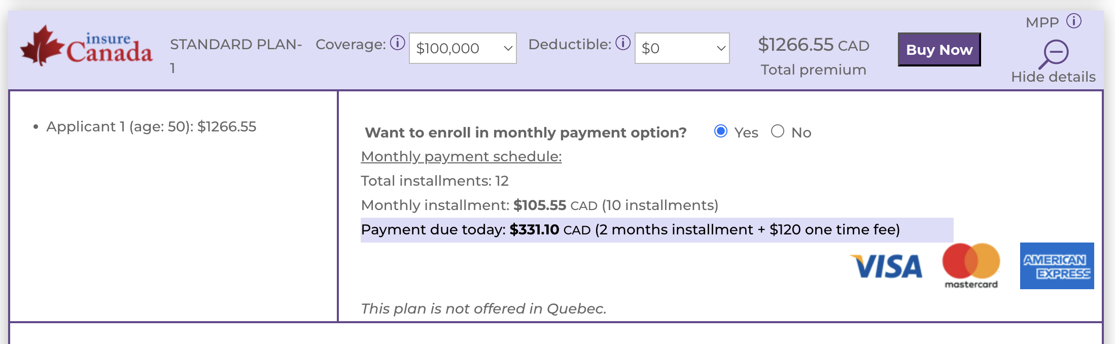 We understand that the cost of medical insurance can be significant. Our website offers a variety of Visitor to Canada insurance plans with options available for monthly payments. Monthly payment option is offered for coverage of $50,000 or more when purchased for a minimum period of three months. When you take quote on our website you will be presented with several plans. On the top right corner you can click on “Show Monthly Plans Only” to display plans that have monthly payment options available for you.